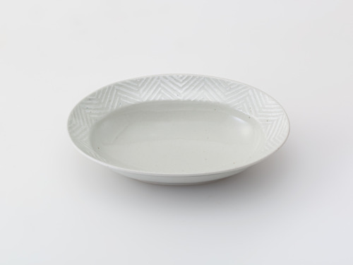 湯のみとして、小鉢として、もちろん本来の通りそば猪口として。鉄器や、和柄のものとも、洋風のものとも相性がいいそば猪口。もともとアパレル業界で働いていたスタッフが企画したORIMEシリーズ。テキスタイルのモチーフを器に展開しました。「ヘリンボーン」は、ざっくりとした編み目が特長。布の素材感を表現するために、あえてムラも活かしてデザインしています。