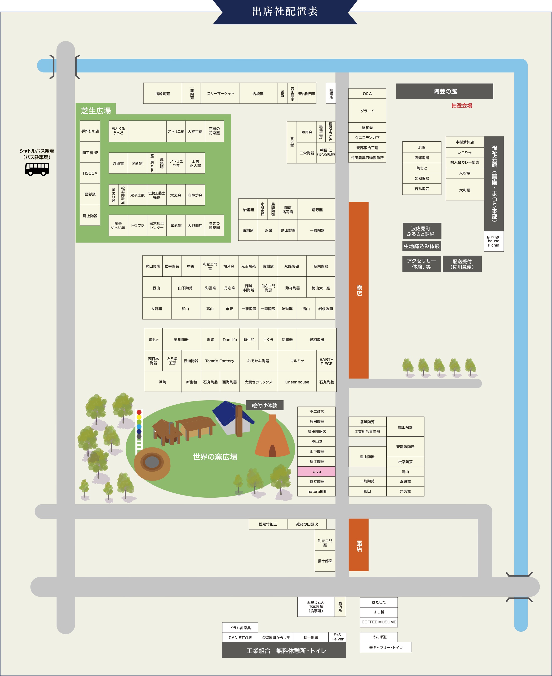 会場の入口から歩いてすぐの所に出店となります。(ピンク枠)