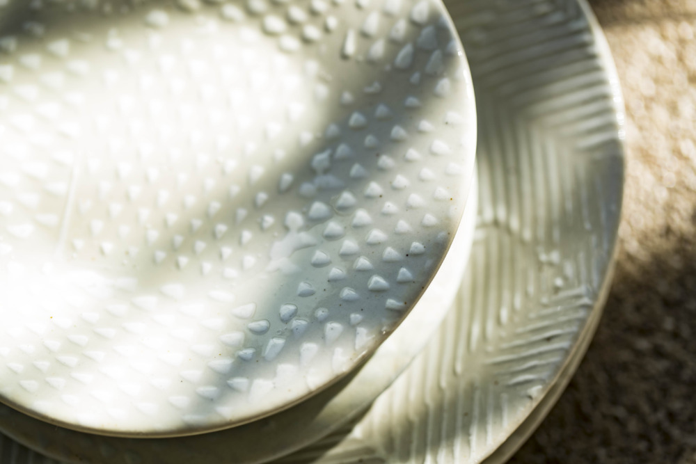 温かみのある陶器の風合いと文様がシンプルだけど心地良い存在感を放っています。