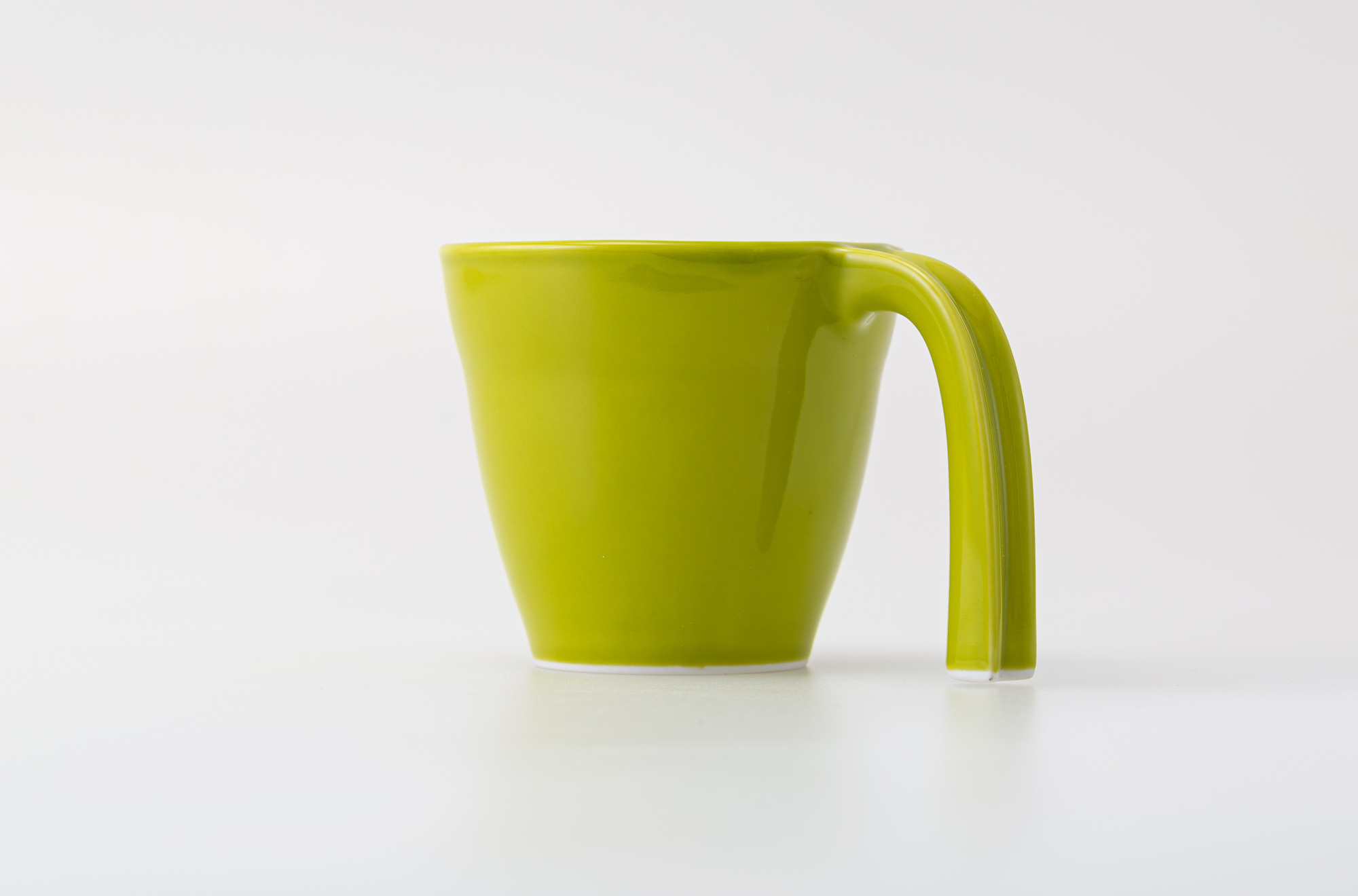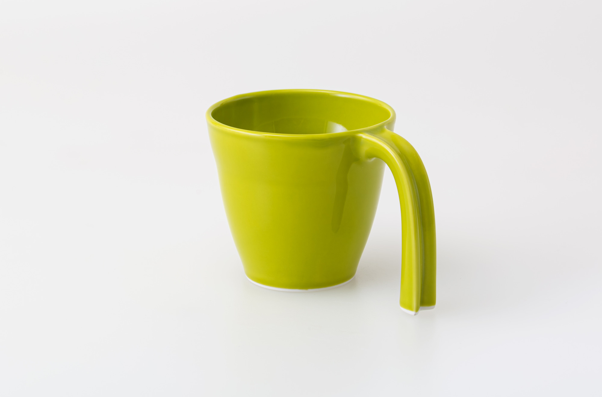 長くアイユーの人気商品として上位に入り続けているe-マグのカラーシリーズ。ユニバーサルデザインの商品です。長いハンドルは、マグの底と同じくテーブルと接し、底とハンドルの2点で支えるつくり。テーブルに置いているときの安定感が違います。ハンドルは、握って使う他に、手をかける方法も。握力の弱いお子さんや高齢の方にも優しい設計です。