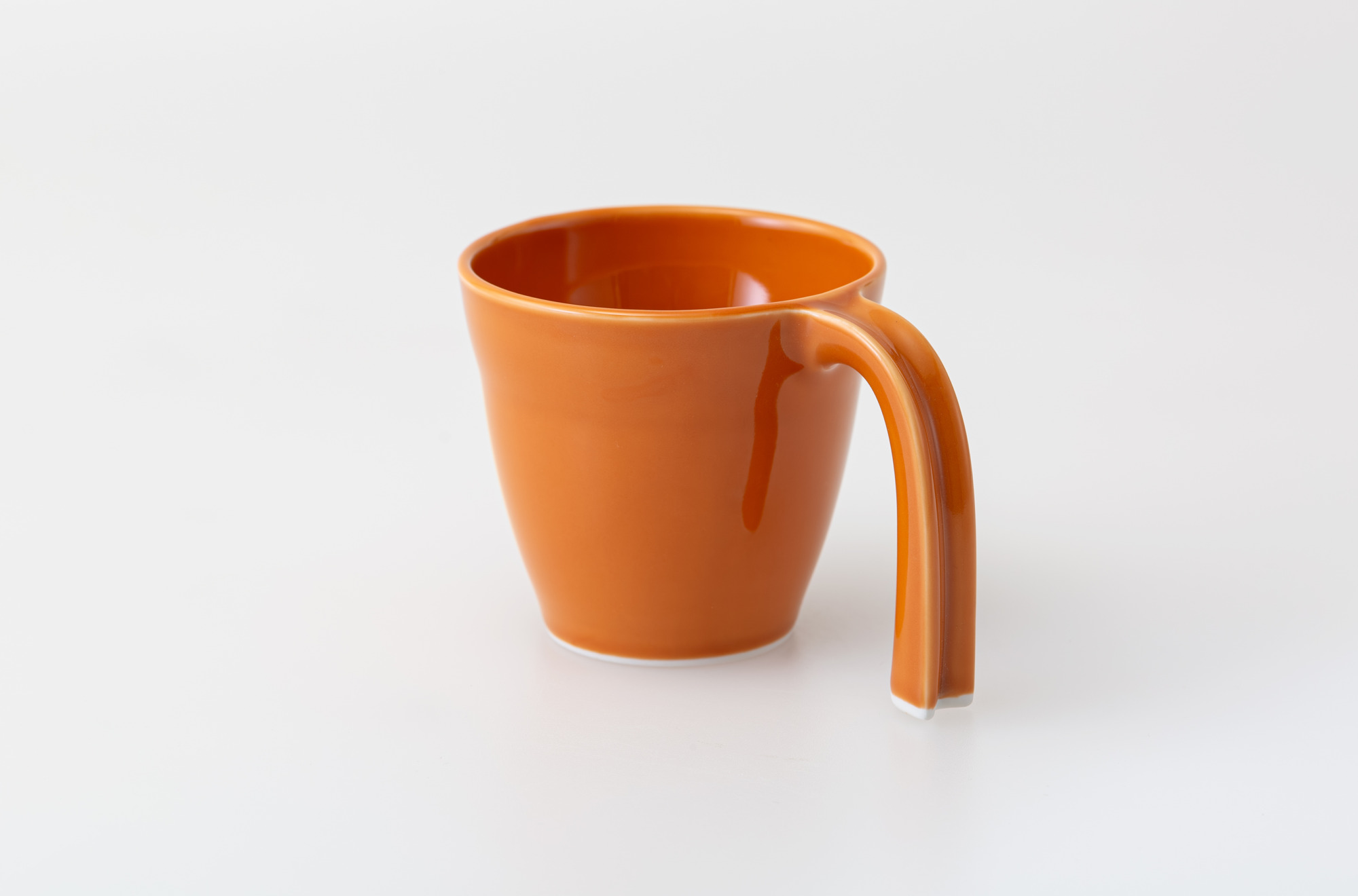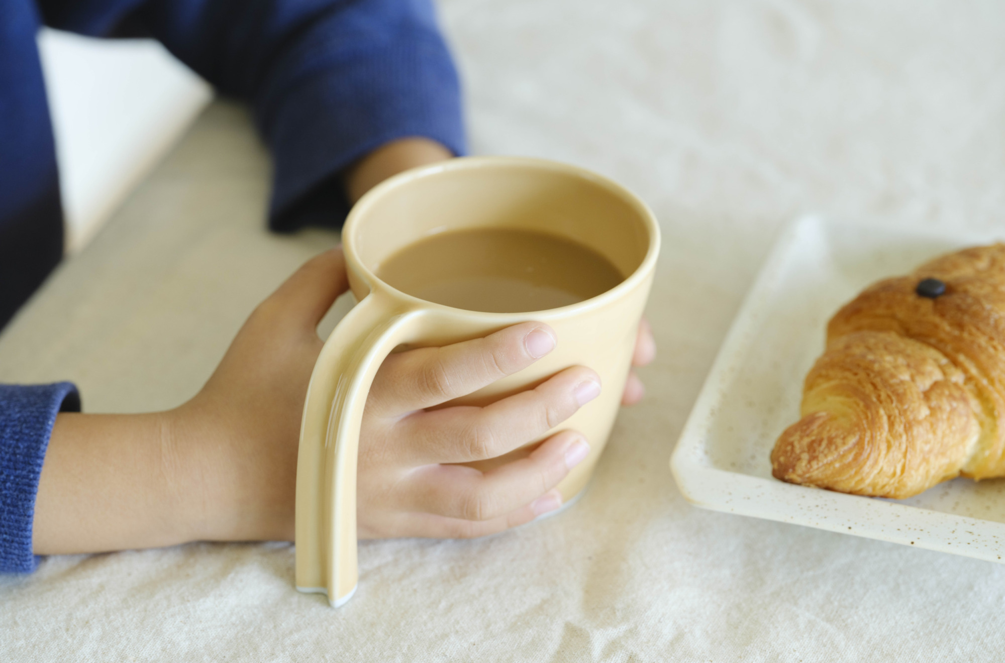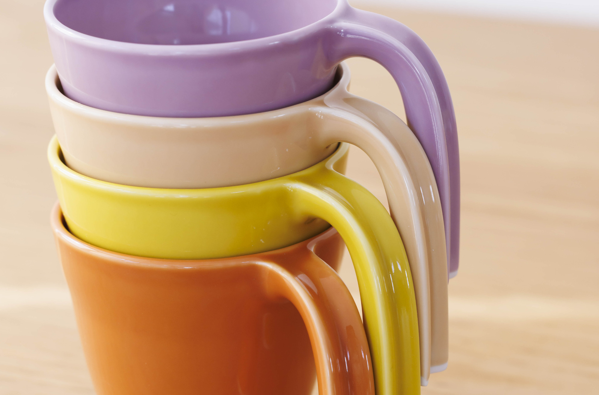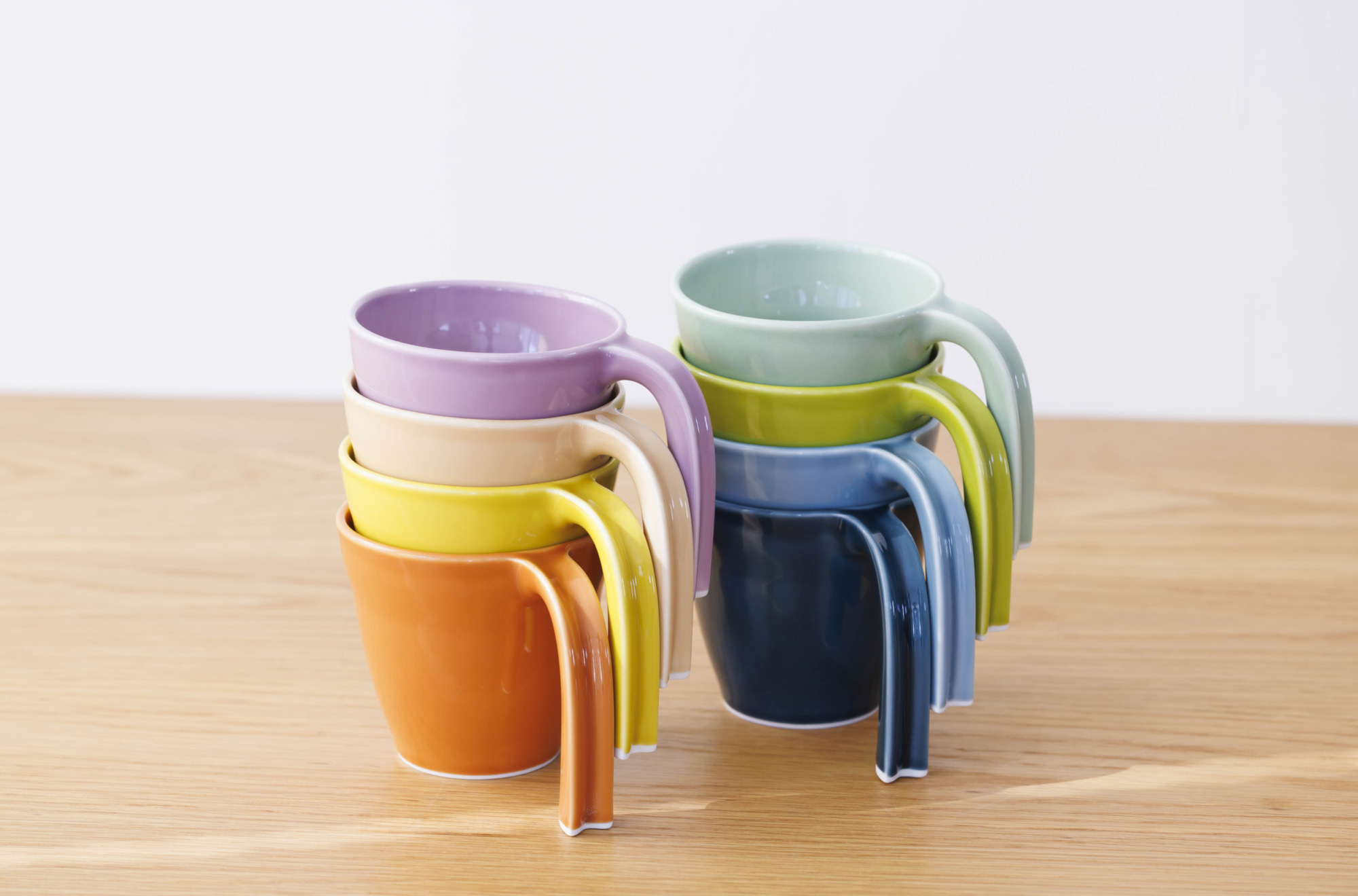 長くアイユーの人気商品として上位に入り続けているe-マグのカラーシリーズ。ユニバーサルデザインの商品です。長いハンドルは、マグの底と同じくテーブルと接し、底とハンドルの2点で支えるつくり。テーブルに置いているときの安定感が違います。ハンドルは、握って使う他に、手をかける方法も。握力の弱いお子さんや高齢の方にも優しい設計です。