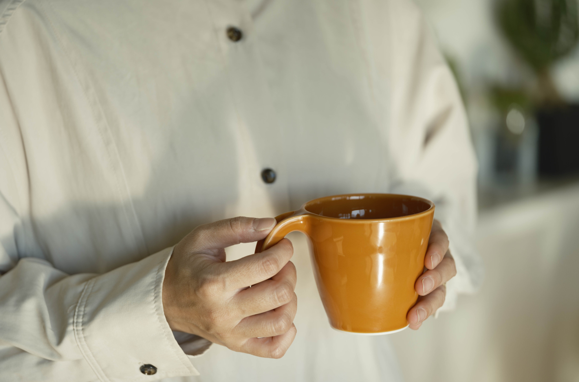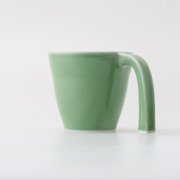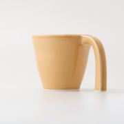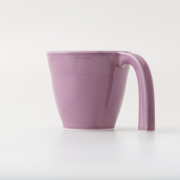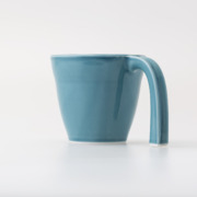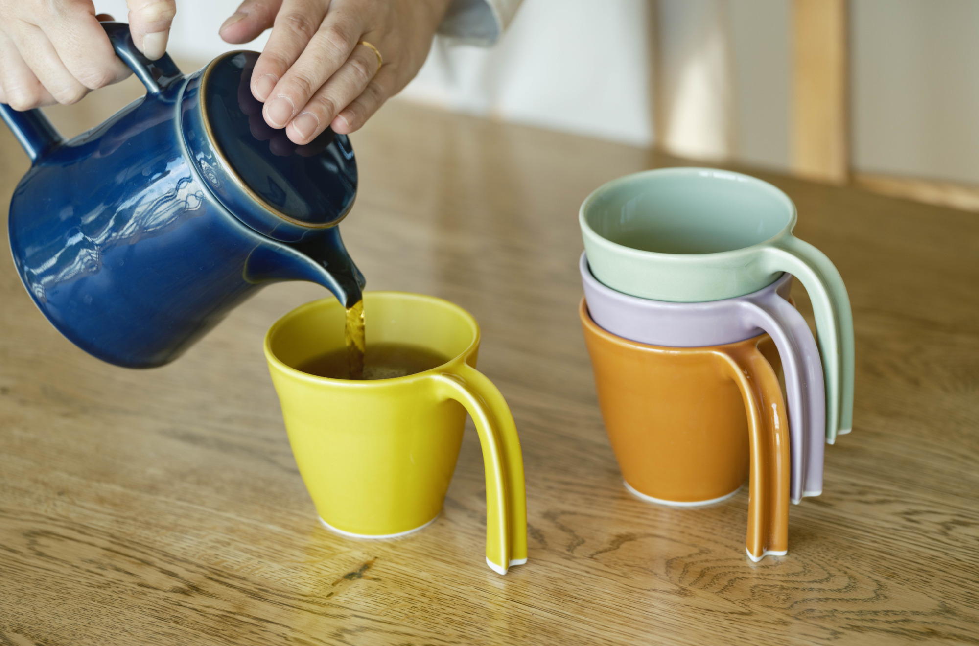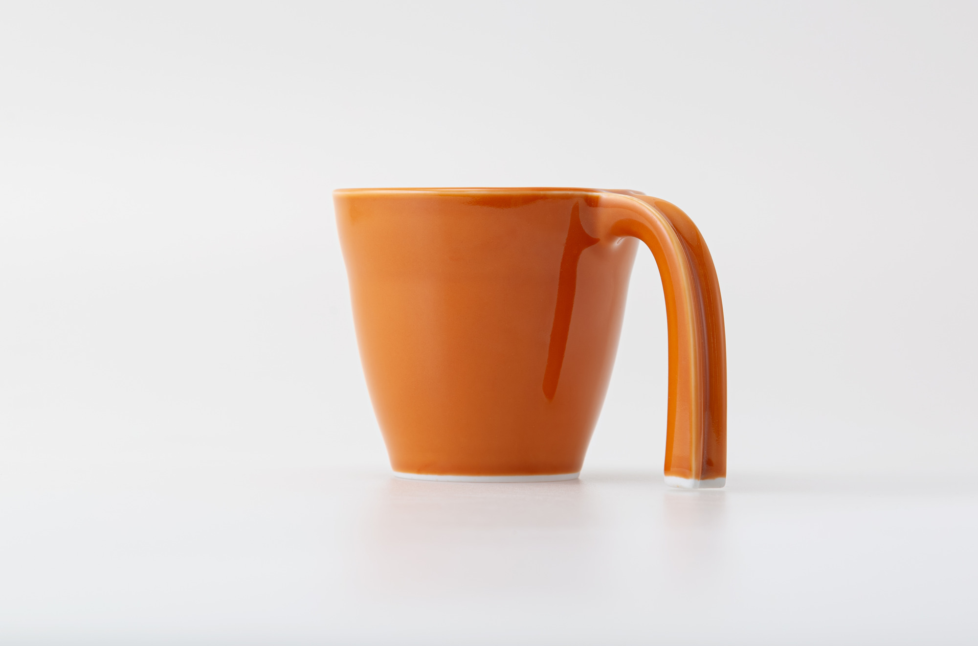 長くアイユーの人気商品として上位に入り続けているe-マグのカラーシリーズ。ユニバーサルデザインの商品です。長いハンドルは、マグの底と同じくテーブルと接し、底とハンドルの2点で支えるつくり。テーブルに置いているときの安定感が違います。ハンドルは、握って使う他に、手をかける方法も。握力の弱いお子さんや高齢の方にも優しい設計です。