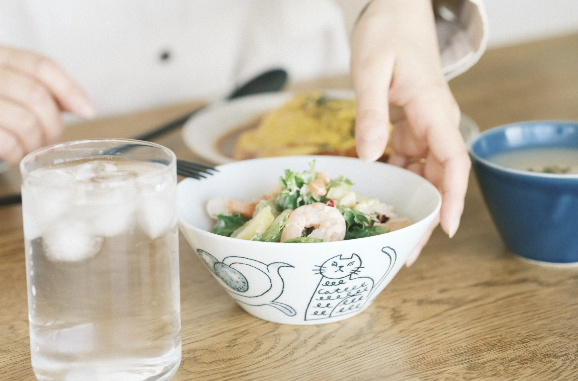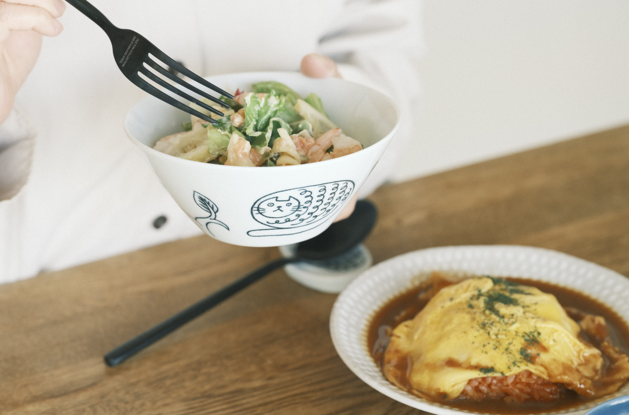 サラダボウル:口が広いため、サラダにもスープにもマルチに使える一枚です。2匹のなんともいえない表情が食卓に平和をもたらします。